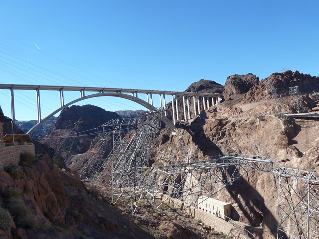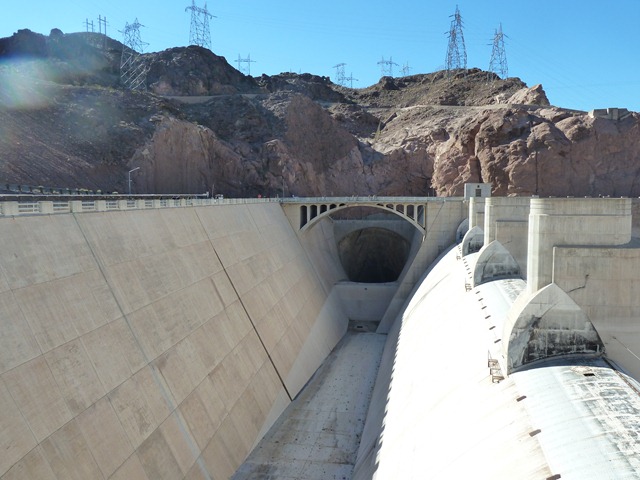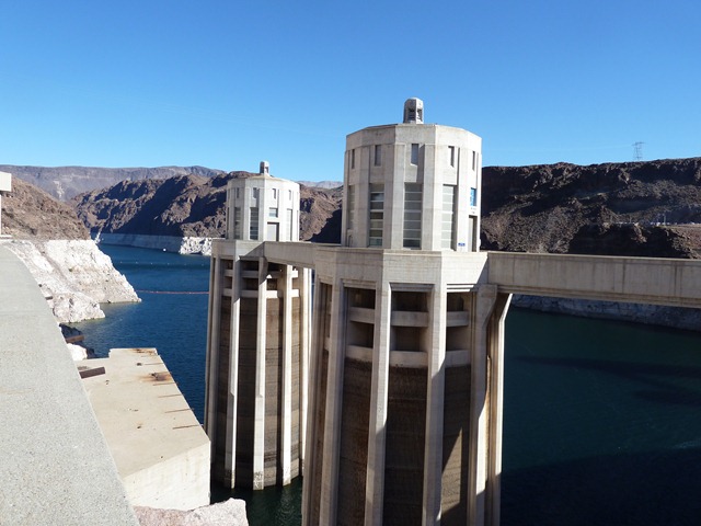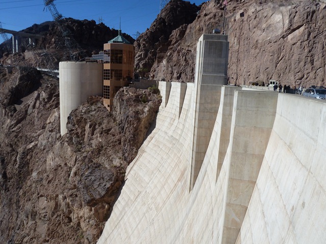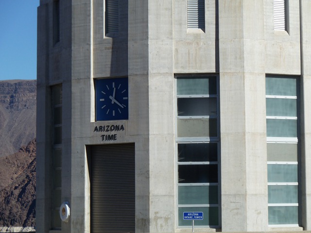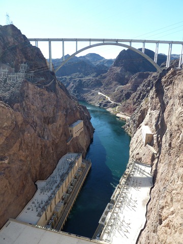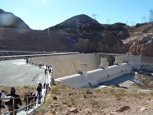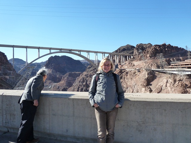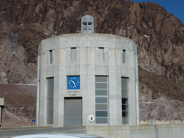 Was ich interessant finde ist, dass die Grenze zwischen den Bundesstaaten Arizona und Nevada genau in der Mitte der Staumauer verläuft. Dies hat zur Folge, dass die östliche Hälfte des Hoover-Staudamms in die Zeitzone der Mountain Time (UTC-7 in Arizona) fällt, die westliche Hälfte in die Zone der Pacific Time (UTC-8 in Nevada). Der Zeitunterschied von einer Stunde lässt sich an zwei Uhren ablesen – im Sommer sind die Zeiten allerdings gleich, da in Arizona keine Sommerzeit gilt. Sind dann über den Damm spaziert was höchste beeindruckend war, nur der Wind war eisig, also lasst euch nicht von dem blauen Himmel täuschen 🙂