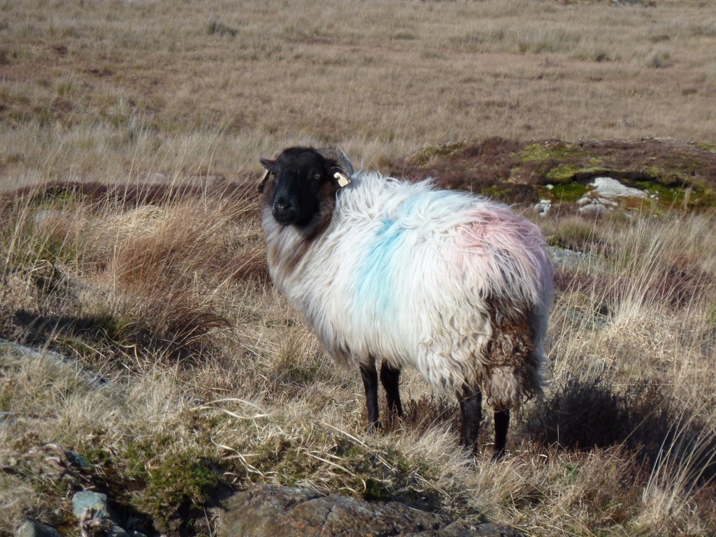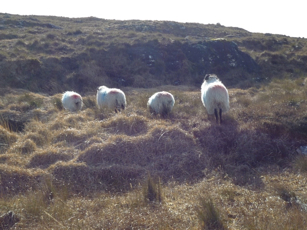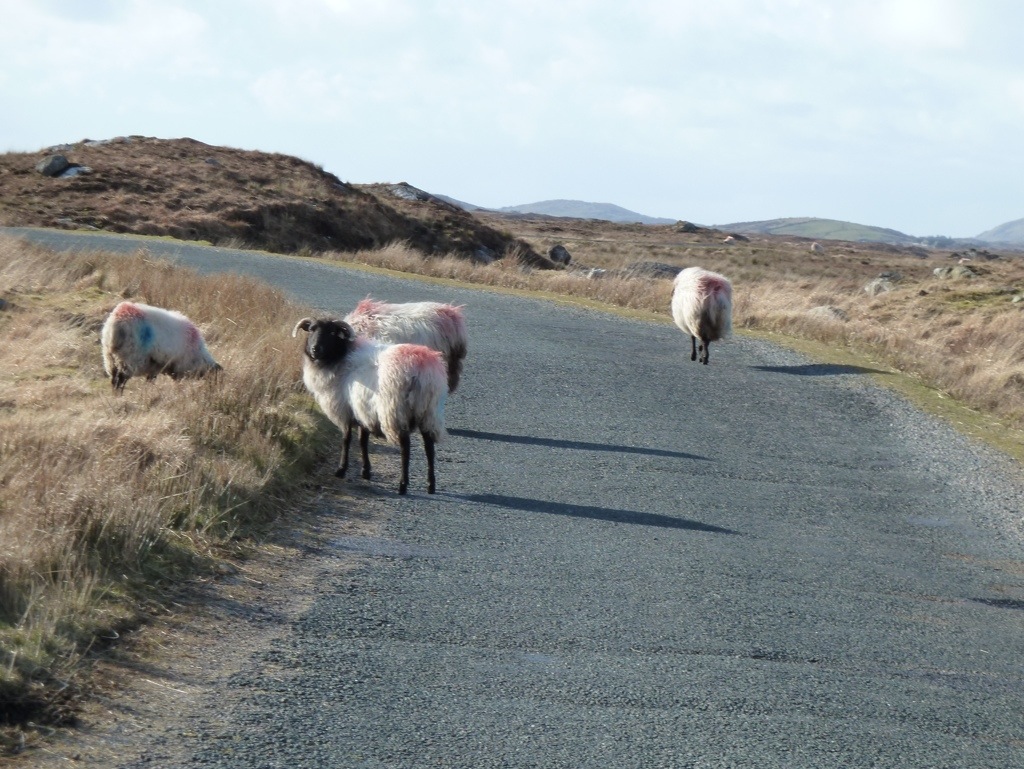 Auf dem Rückweg nach Clifden sind wir dann endlich noch ein paar Schafen mitten auf der Straße begegnet. Alles bunte Schafe hier, und zwar deshalb, damit man die besser zuordnen kann.