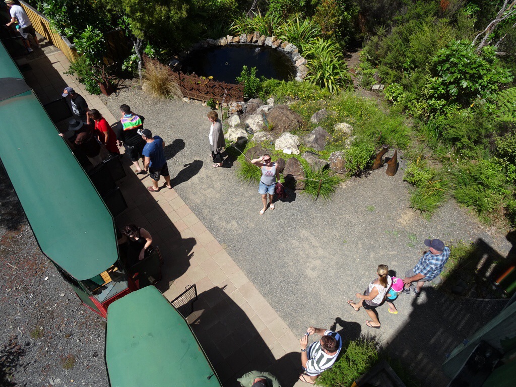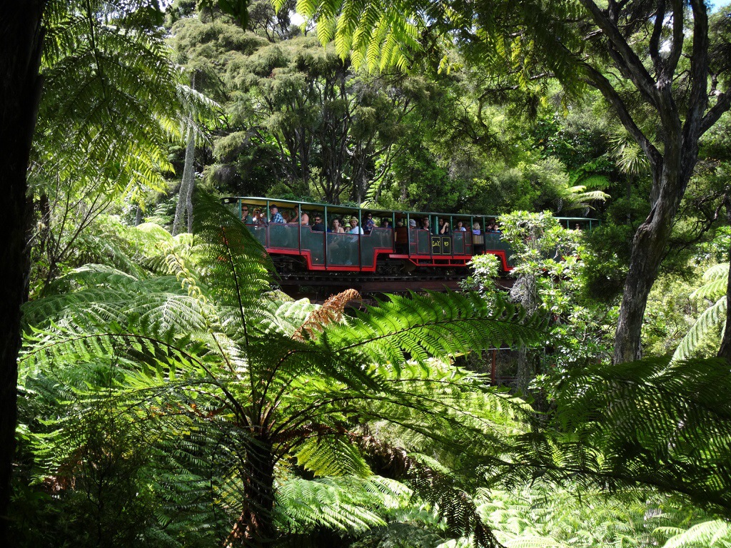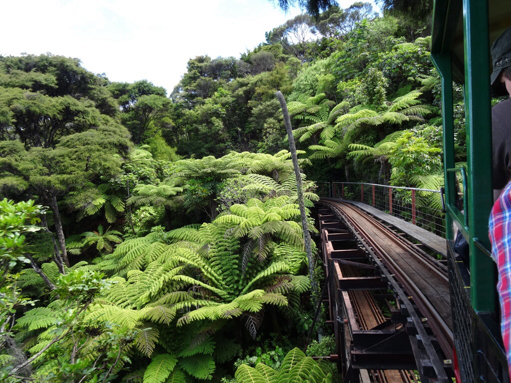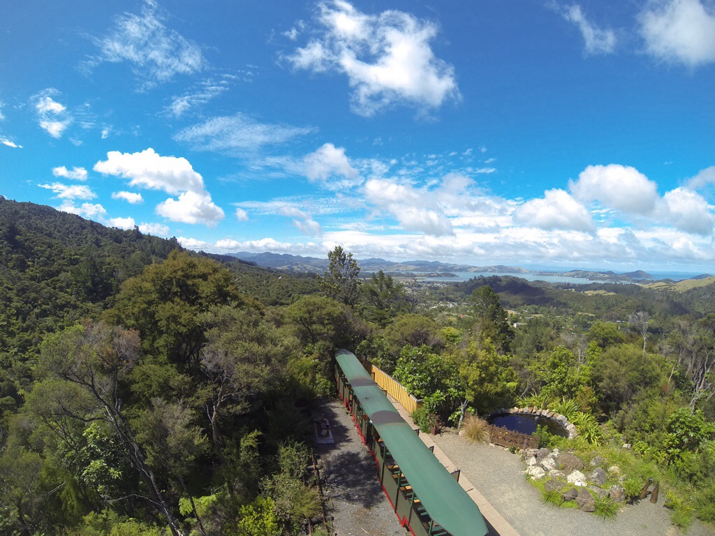 Dabei haben wir aber noch einen Zwischenstopp eingelegt um in Coromandel Town mit dem Driving Creek Railway zu fahren, eine Schmalspurbahn. Sie entstand Mitte der 1970er Jahre, um Rohstoffe für eine Töpferei aus den Bergen zu holen. Schon lange transportiert die Bahn jedoch mehr Ausflügler als Fracht. Die Strecke windet sich mehr als 3 km in die Berge mit unzähligen Kurven, ein paar „hautengen“ Tunnelröhren, einer Spirale, einem doppelstöckig zu befahrenen Abschnitt, sowie mehreren Spitzkehren.