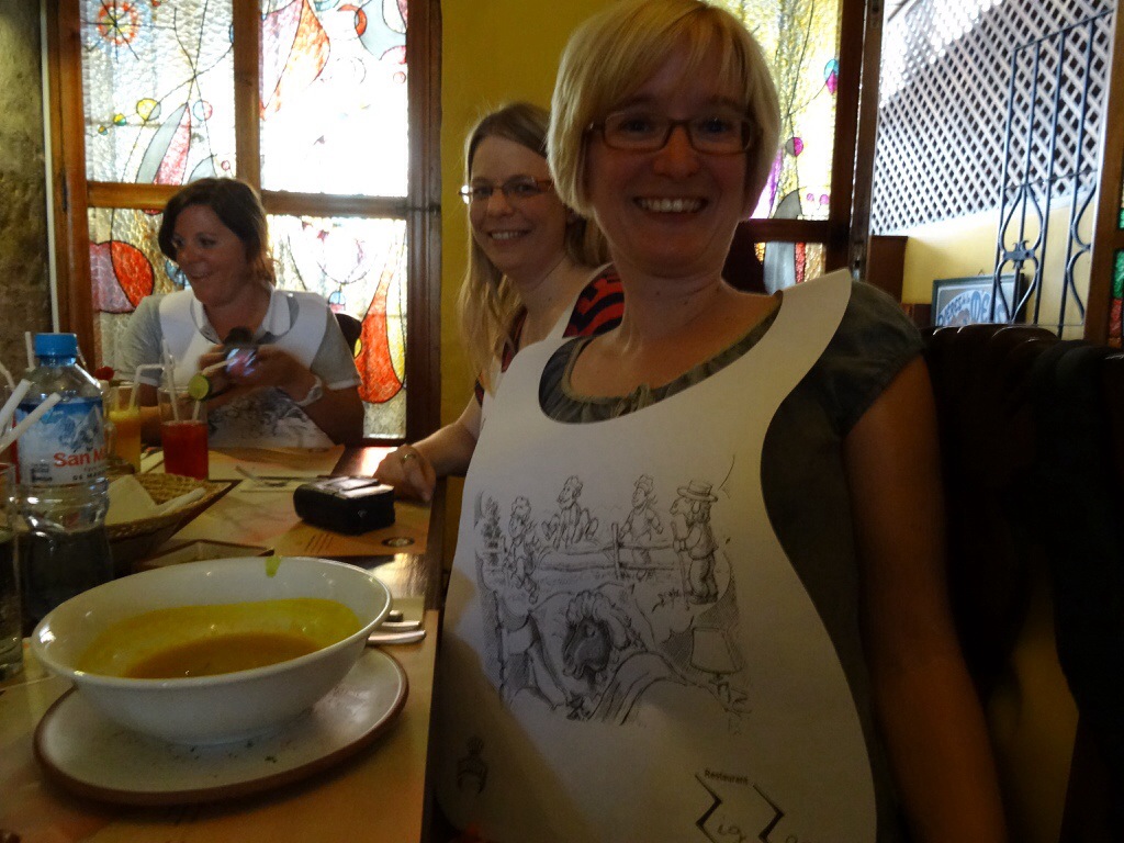 Wir bekommen alle einen Schlabberlätzchen um, da die meisten von uns Alpaca vom heißen Stein bestellen.