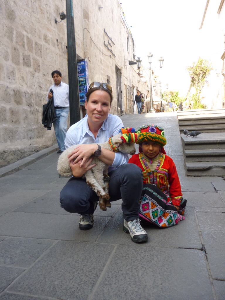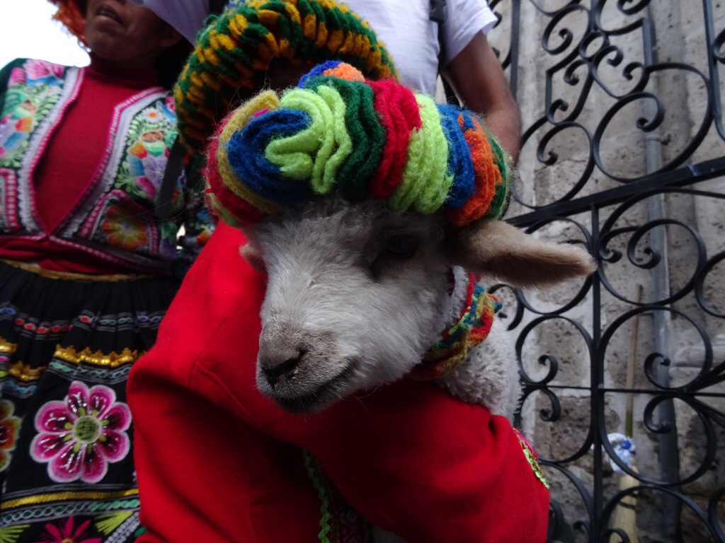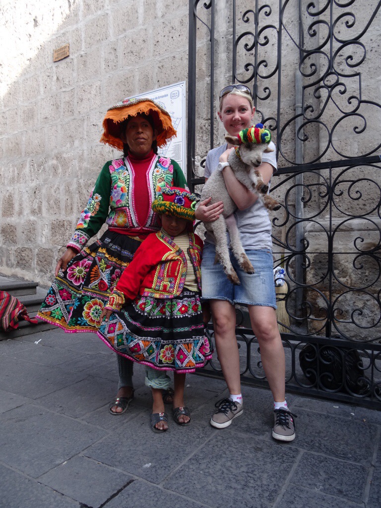 Auf dem Weg zu Juanita treffen wir eine Frau mit ihrer Tochter (welche ein kleines Lamm auf dem Arm hält) in Andentracht. Sofort werden Fotos gemacht. Ich kann natürlich nicht widerstehen und muss das Lämmchen auf den Arm nehmen. Noch eine halbe Stunde vorher haben manche Mitreisende sowas süßes gegessen! Ich bin einfach nur glücklich ein echtes Lamm auf dem Arm zu halten. Dank Ronald unterhalten wir uns kurz mit der Frau. Wir sind „geschockt“, sie ist 34 und hat bereits 6 Kinder. Zwei davon haben in Arequipa Stipendien gekriegt. Wir vermuten, dass sie schon sehr jung Mutter geworden ist.