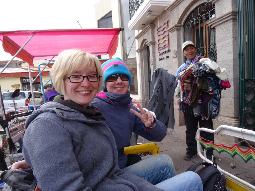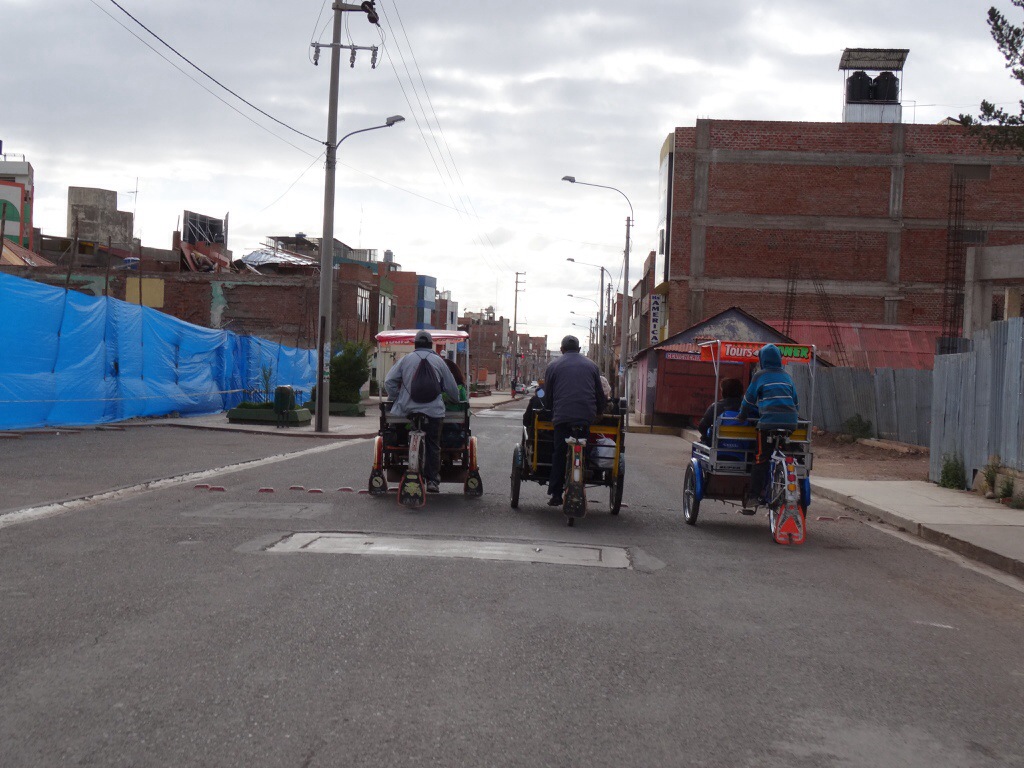 Draußen vor unserem Hotel in Puno stehen für uns alle kleine Fahrrad-Taxis bereit die uns runter zum Titicacasee bringen.