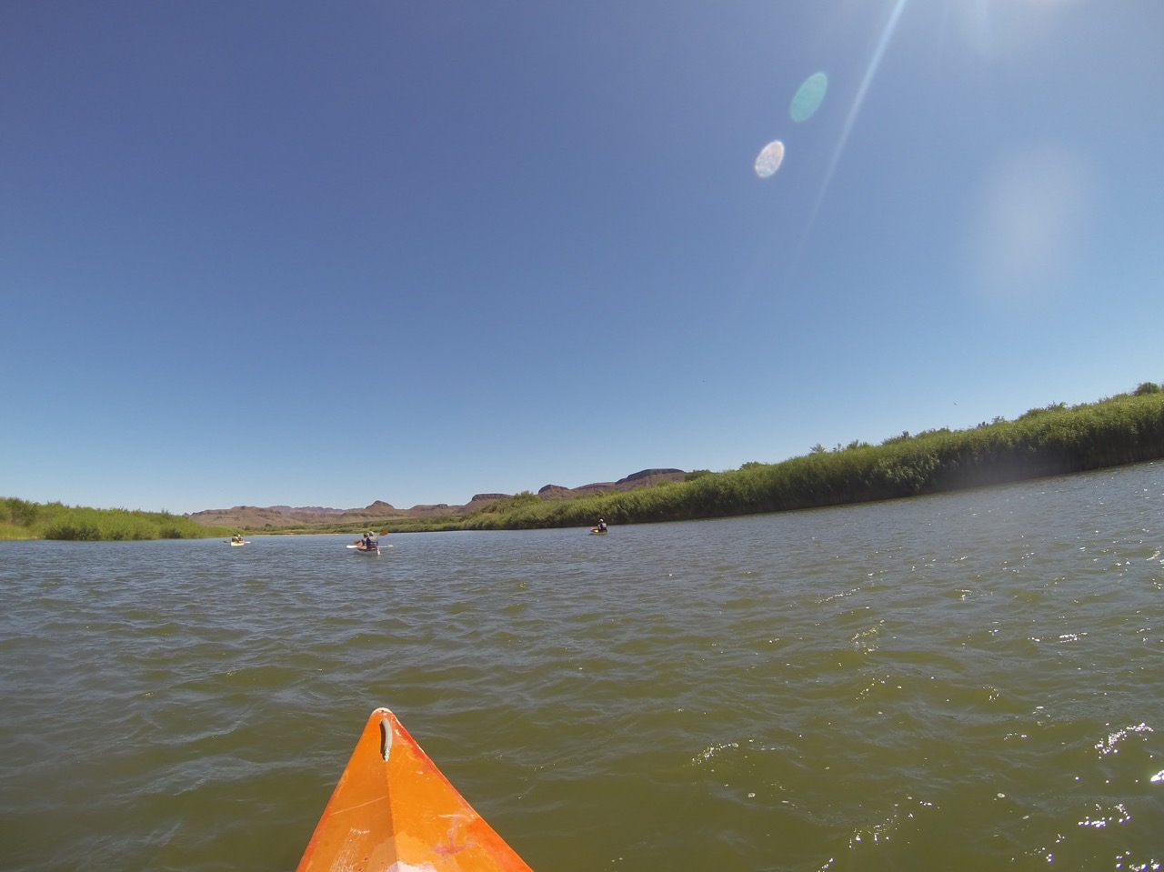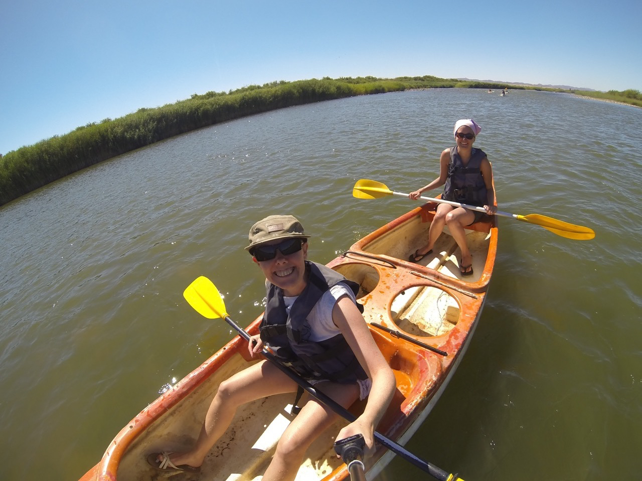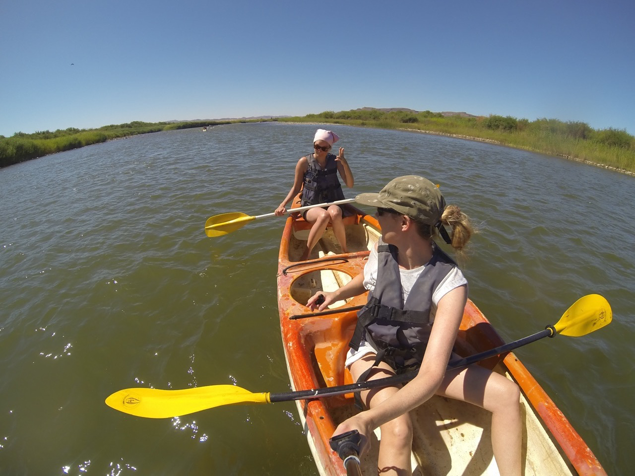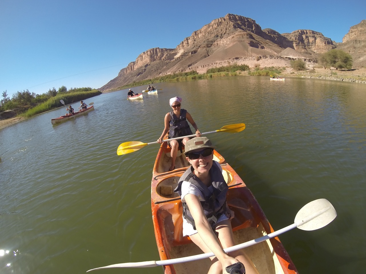 Am nächsten Tag bewegen wir uns nur mit dem Kanu fort. Wir legen mehr oder weniger die Füβe hoch und relaxen, während die Strömung uns flussabwärts trägt, Annika ist der Captain und ich der Motor. Ohne Kentern schaffen wir es dann auch nach knapp 3 Stunden zurück zu uns in Camp. Morgen werden uns bestimmt die Oberarme weh tun, aber dafür hatten wir eine grandiose Aussicht auf dem Orange River zwischen Namibia und Südafrika.
