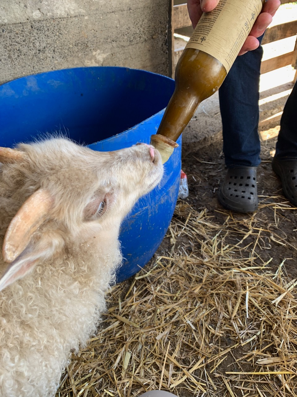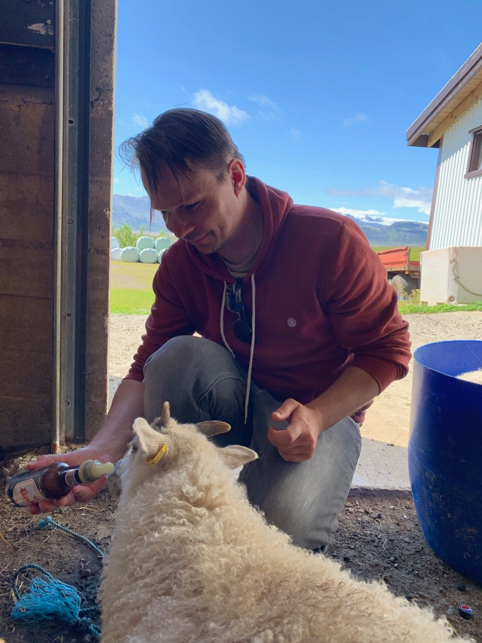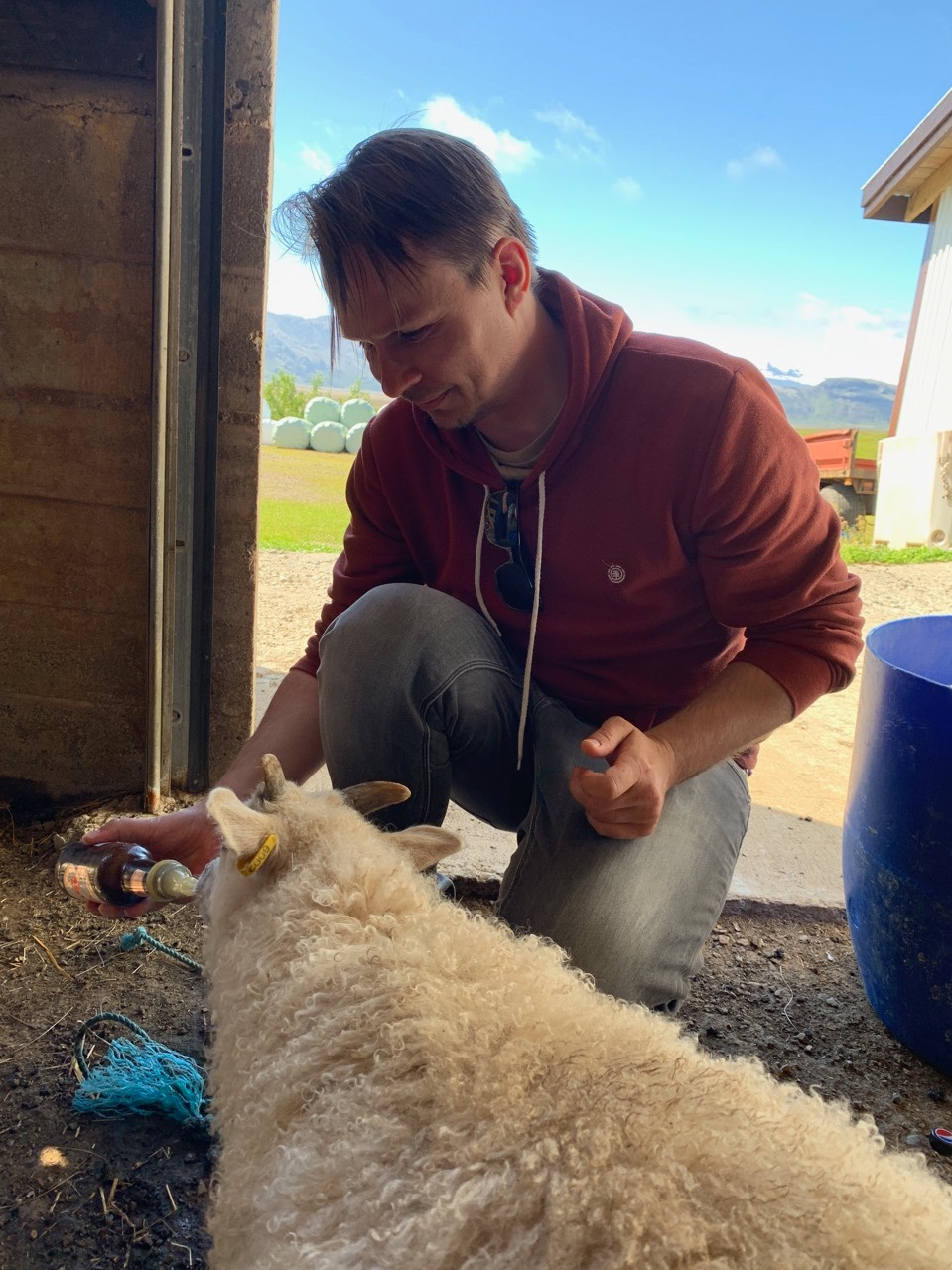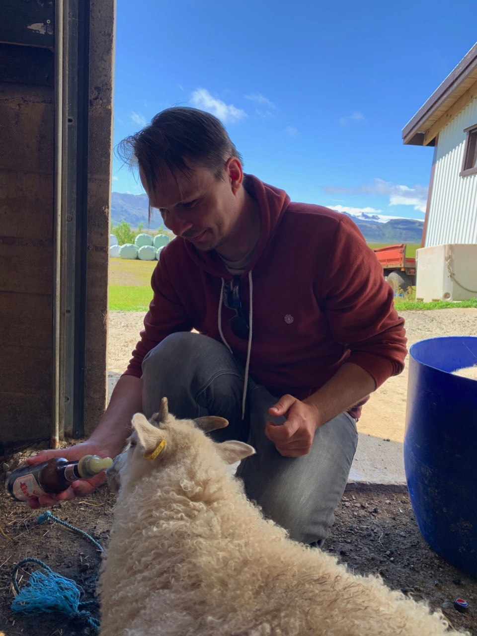 Und tatsächlich, ich habe Glück. Stefan, der Hofbesitzer, lässt uns die Lämmer füttern, die leider ihre Mutter verloren haben.