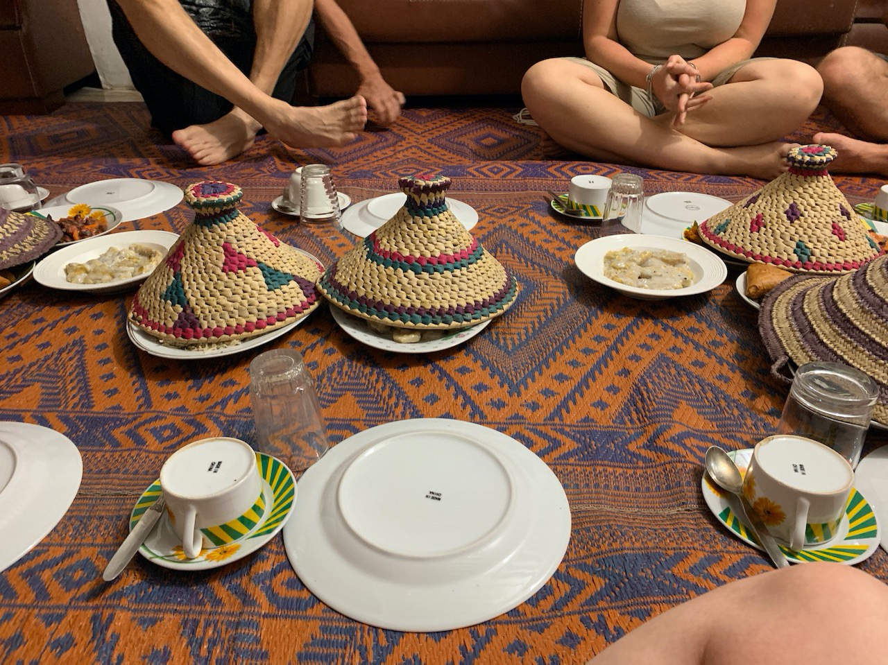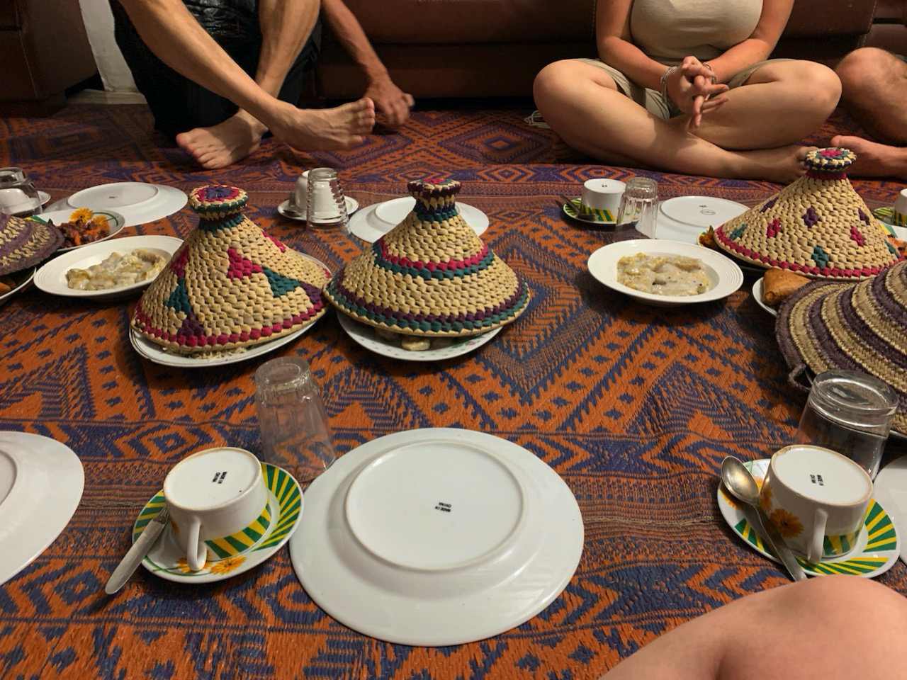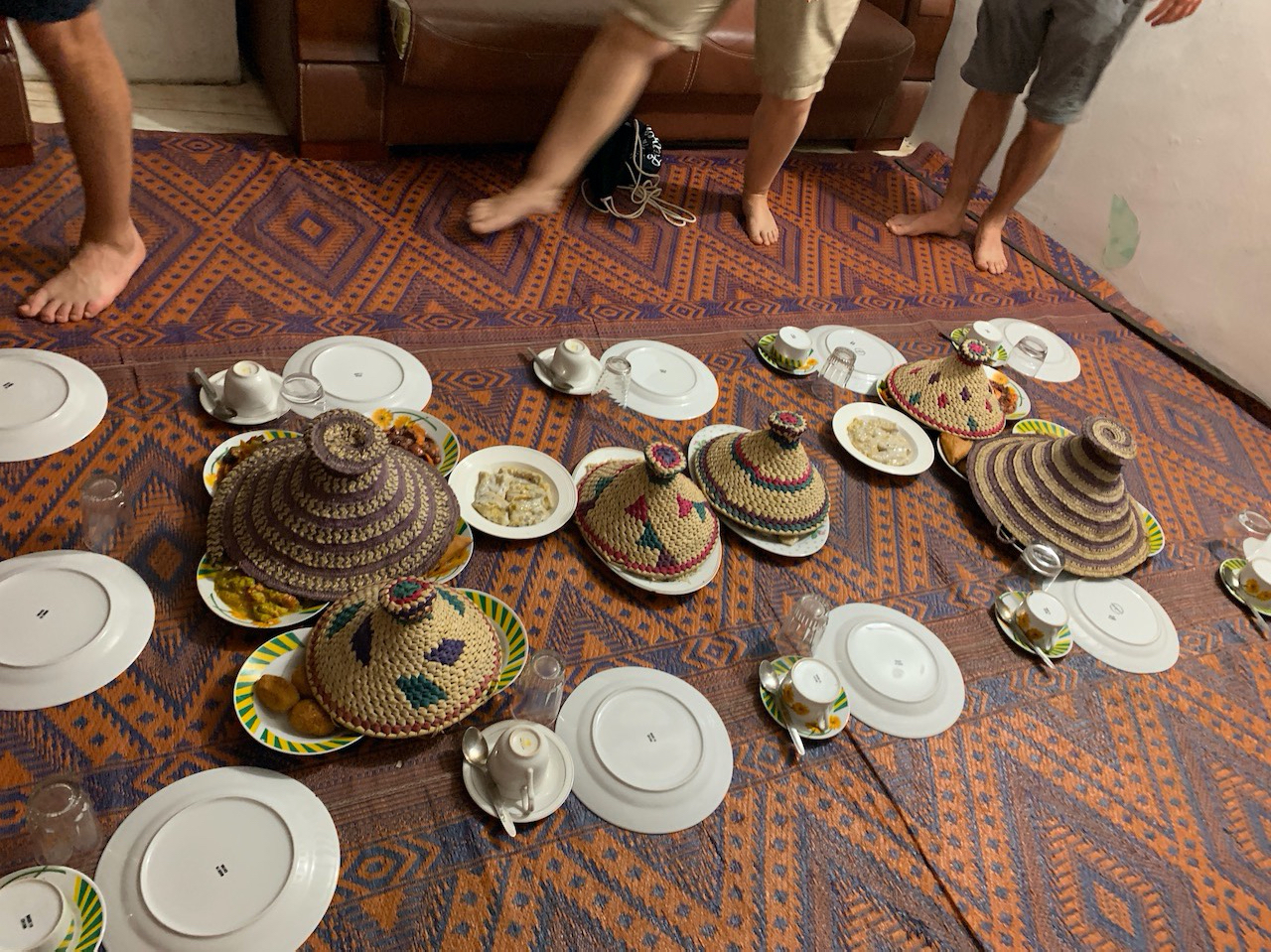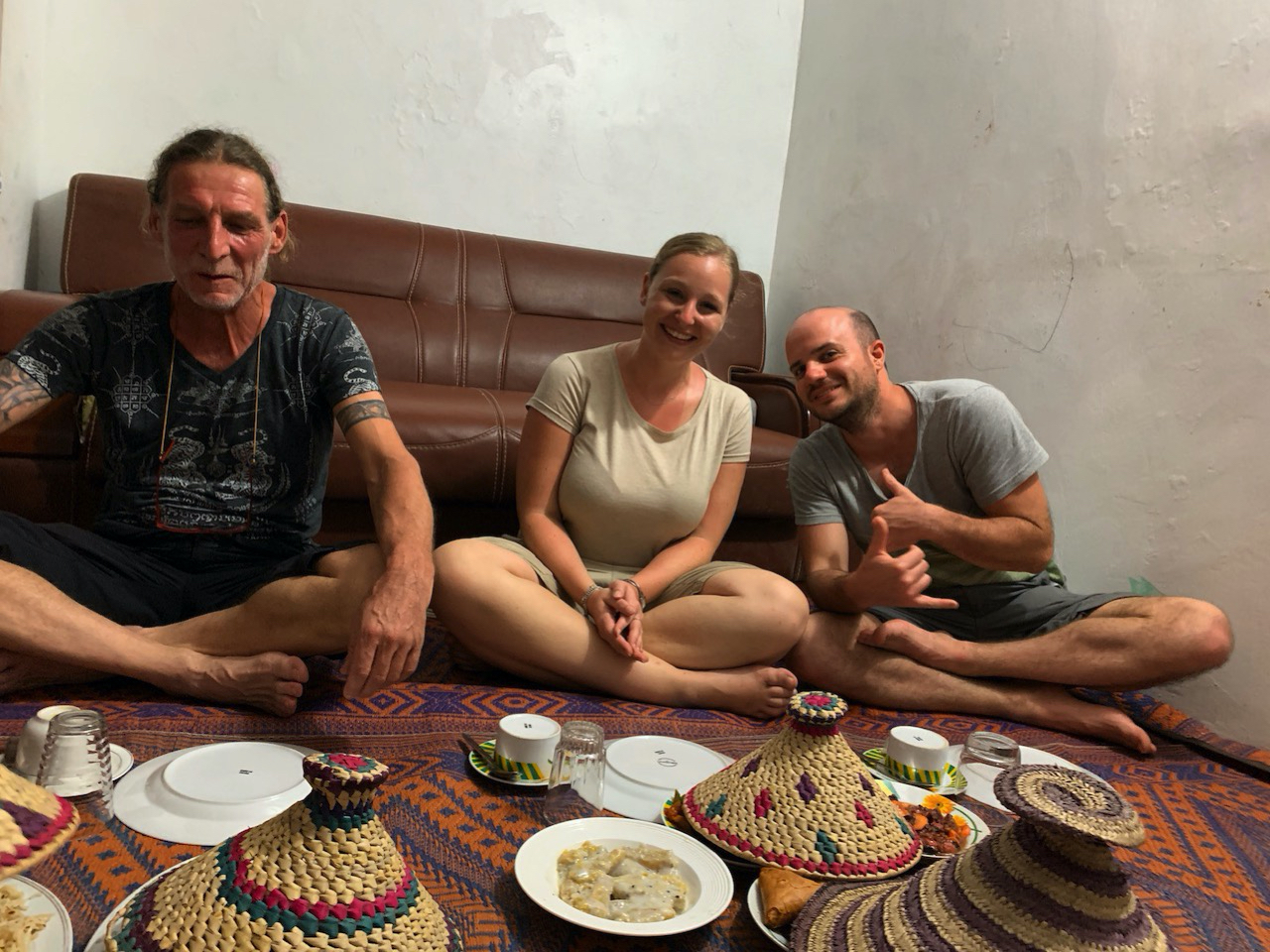 Landestypisch sitzen wir auf dem Boden und essen mit den Händen.
