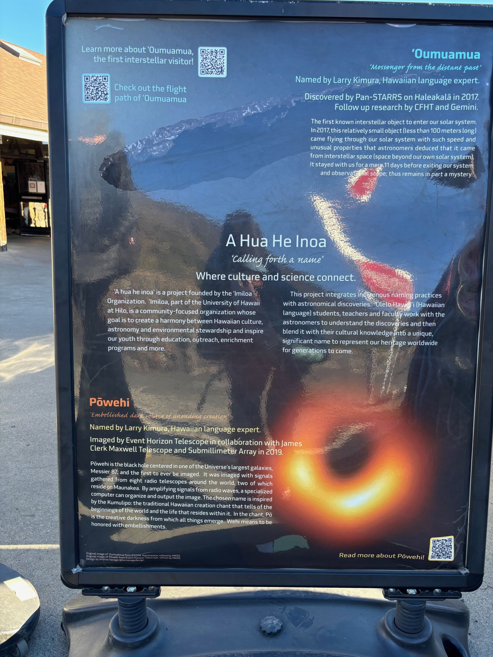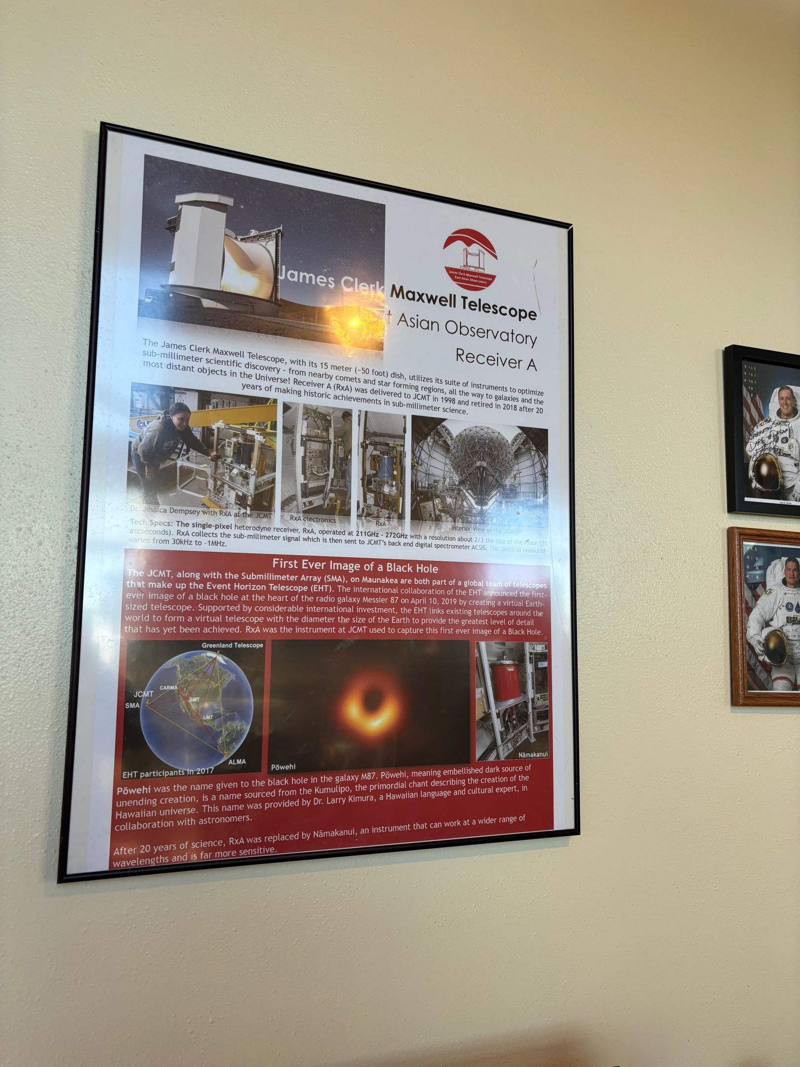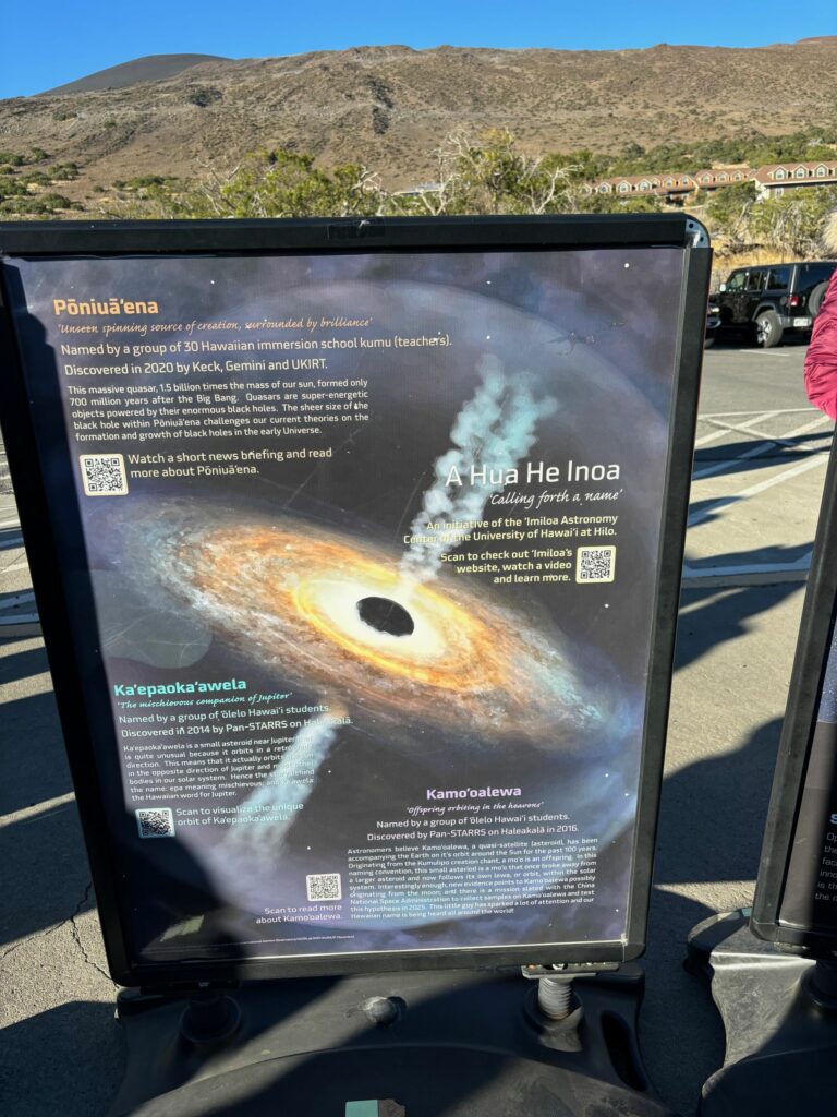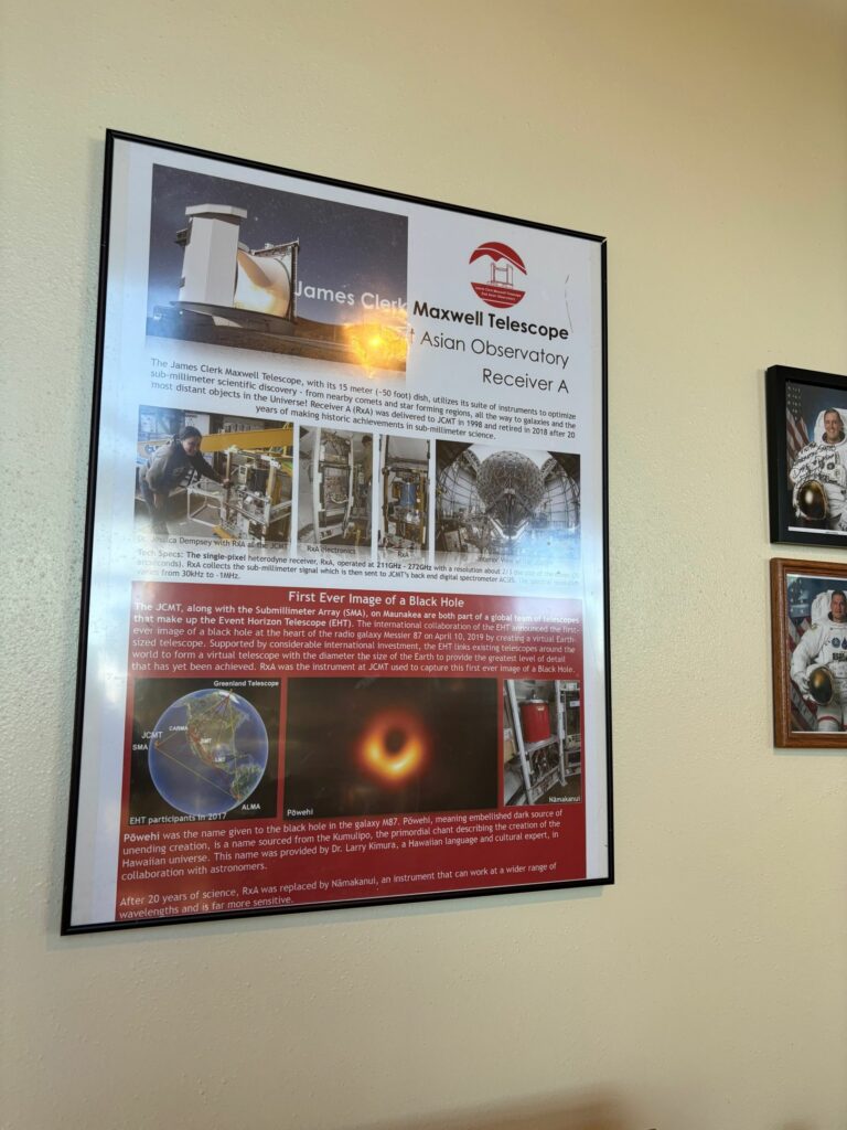 Hier kann man Souvenirs shoppen, etwas zu Essen kaufen und es gibt eine kleine Ausstellung zu den Observatorien auf dem Gipfel. Die Ausstellung zeigt einem, in welchen Projekten die Observatorien involviert waren. Natürlich finde ich auch mein persönliches Lieblingsprojekt: Event Horizon – das Projekt hat das erste Bild von einem schwarzen Loch veröffentlicht.
