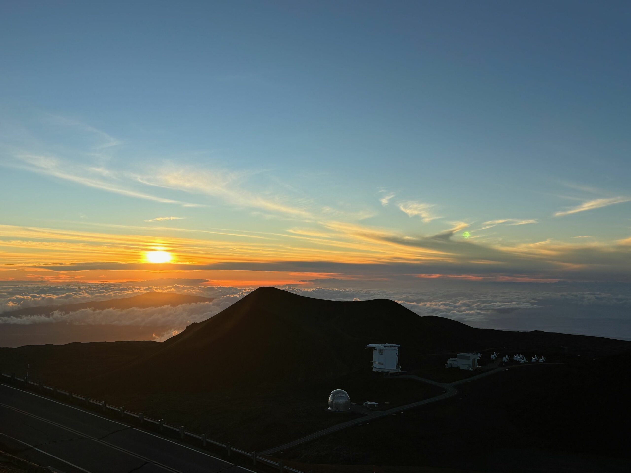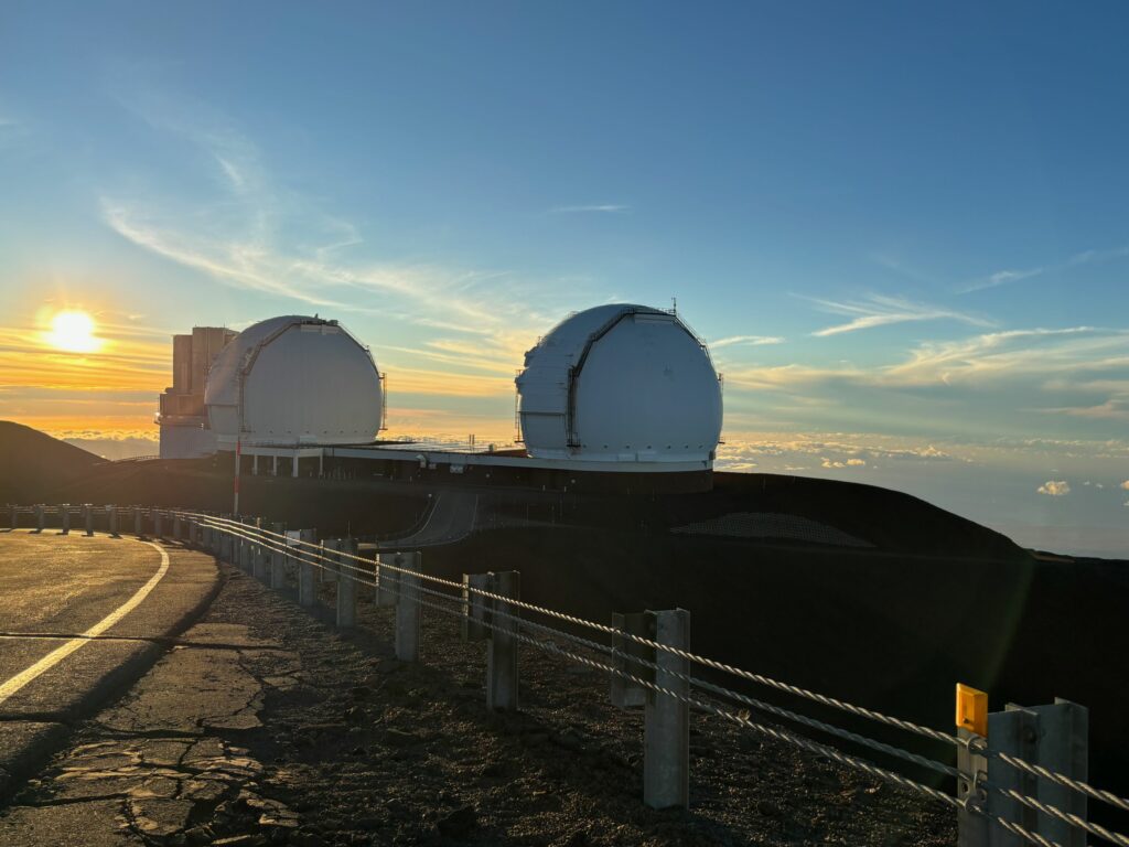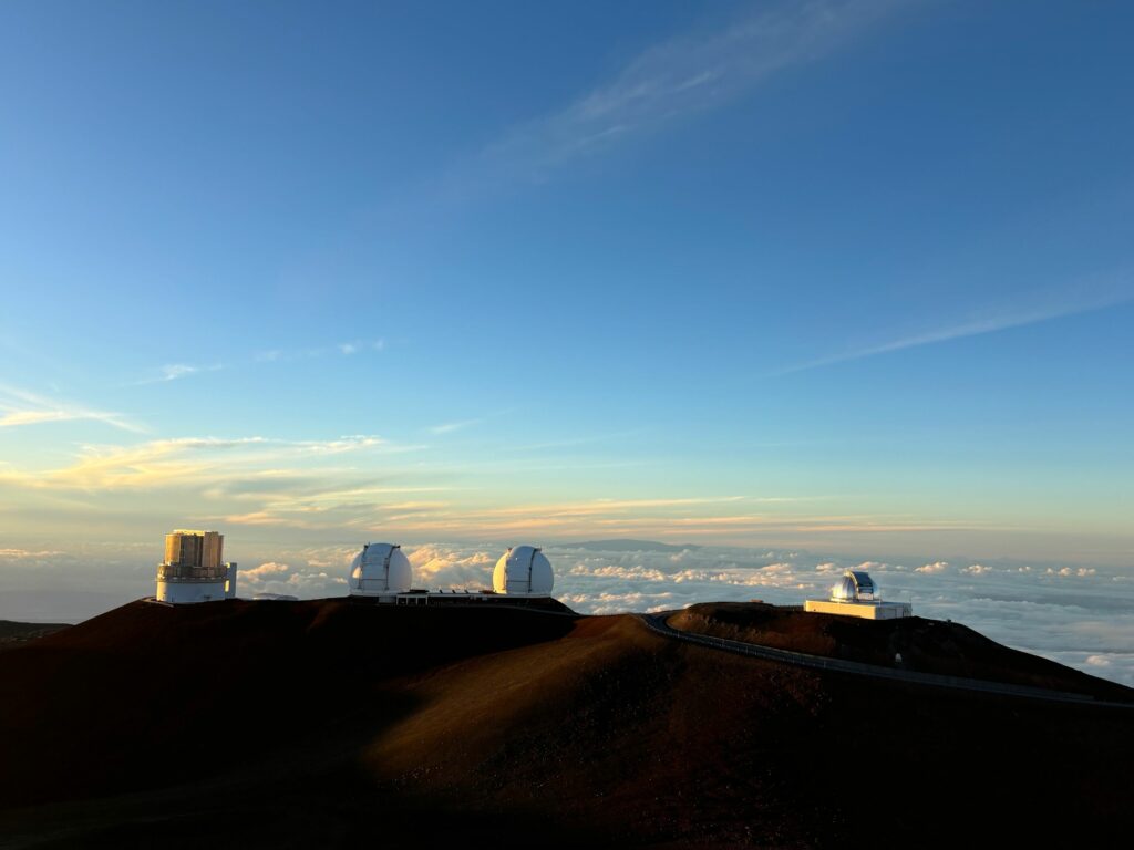 Und dann ist es endlich soweit, in der Ferne tauchen die mächtigen Observatorien auf. Über den Wolken des Mauna Kea observieren internationale Forscherteams das Weltall.