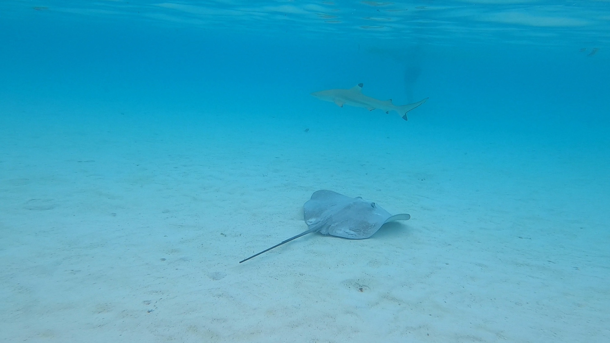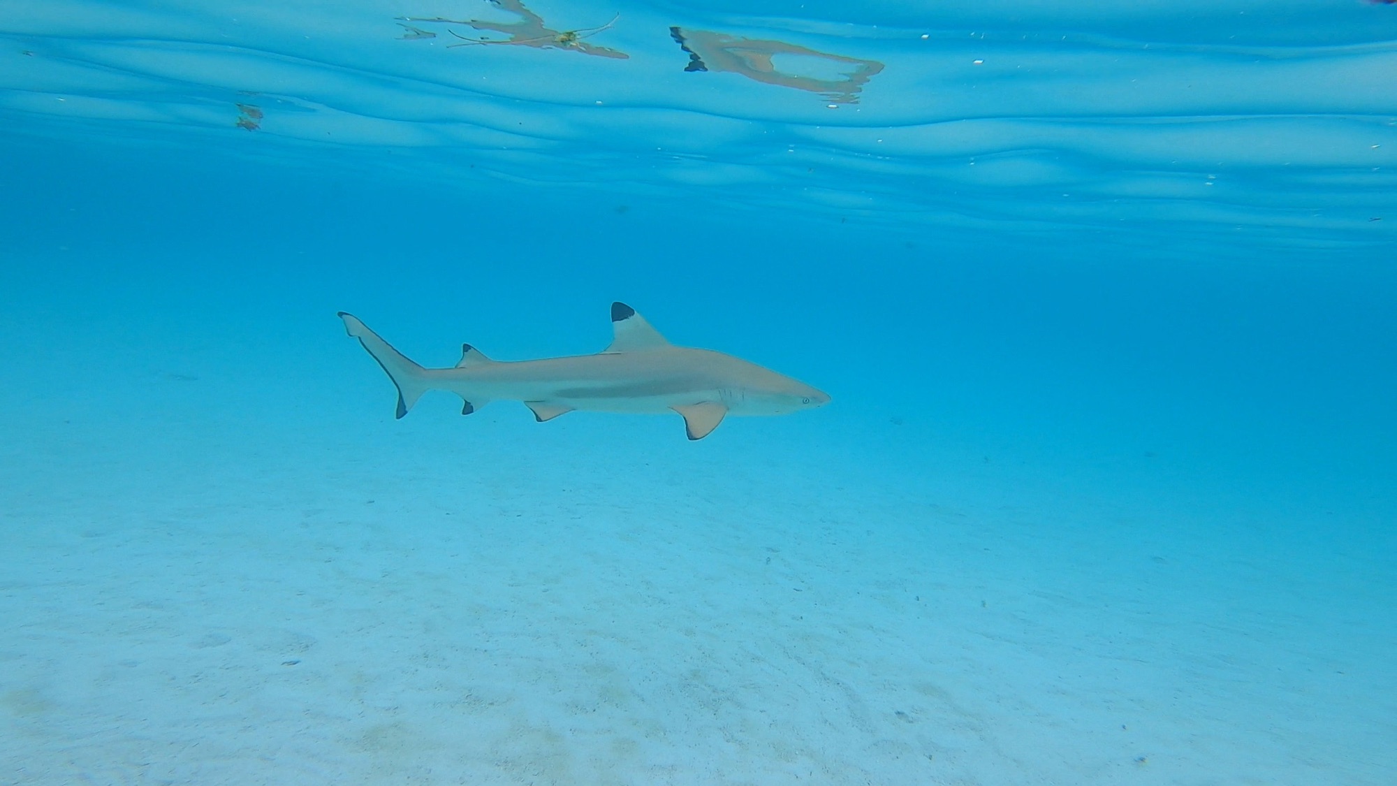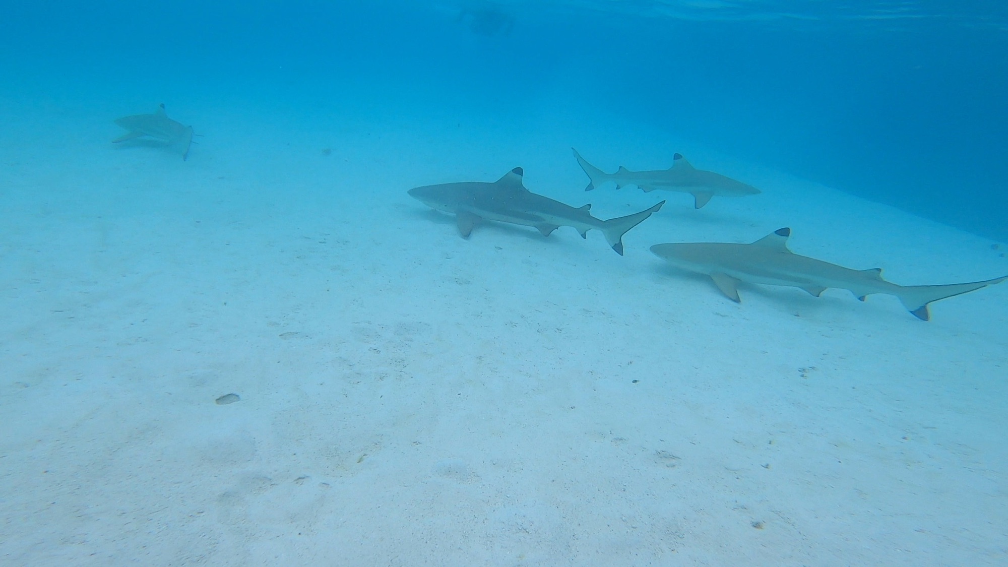Wir sehen die ersten Haie. Es sind Schwanzspitzen riffhaie, kein Grund zur Sorge, sie sind recht klein, aber doch viele auf einem Haufen.